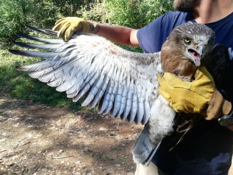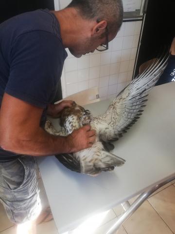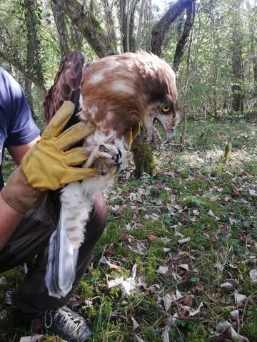 Un oiseau de cette envergure ne peut pas voler en sous-bois. Et ce n’est ni son lieu de repos, ni son milieu de chasse. Elle tente alors de s’approcher et l’oiseau s’enfuit en marchant et peine à voler. En constatant la détresse de l’oiseau, elle décide d’appeler des renforts. Ils parviendront sans trop de difficulté à capturer le Circaète. Un rapide examen ne permet pas de détecter la cause de sa détresse. Seule une gale est visible autour de son bec, mais cela ne semble pas être la source de son affaiblissement.